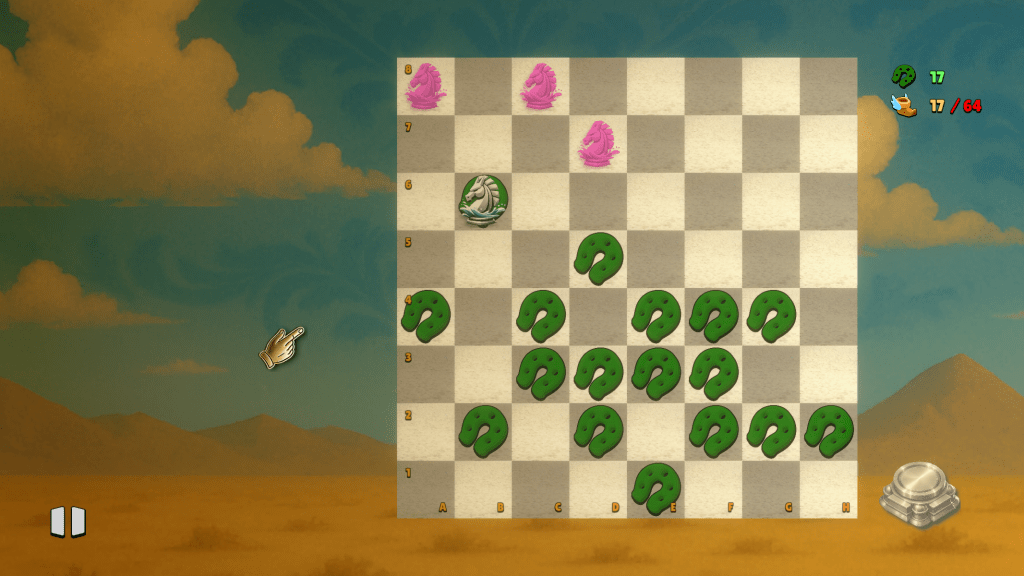 a thoughtful, challenging single-player 2D puzzle game inspired by the unique movement of the knight in chess. Your task is simple in concept but complex in execution: place a knight on the board and move it according to standard chess rules, aiming to visit as many squares as possible before you run out of moves or legal options.